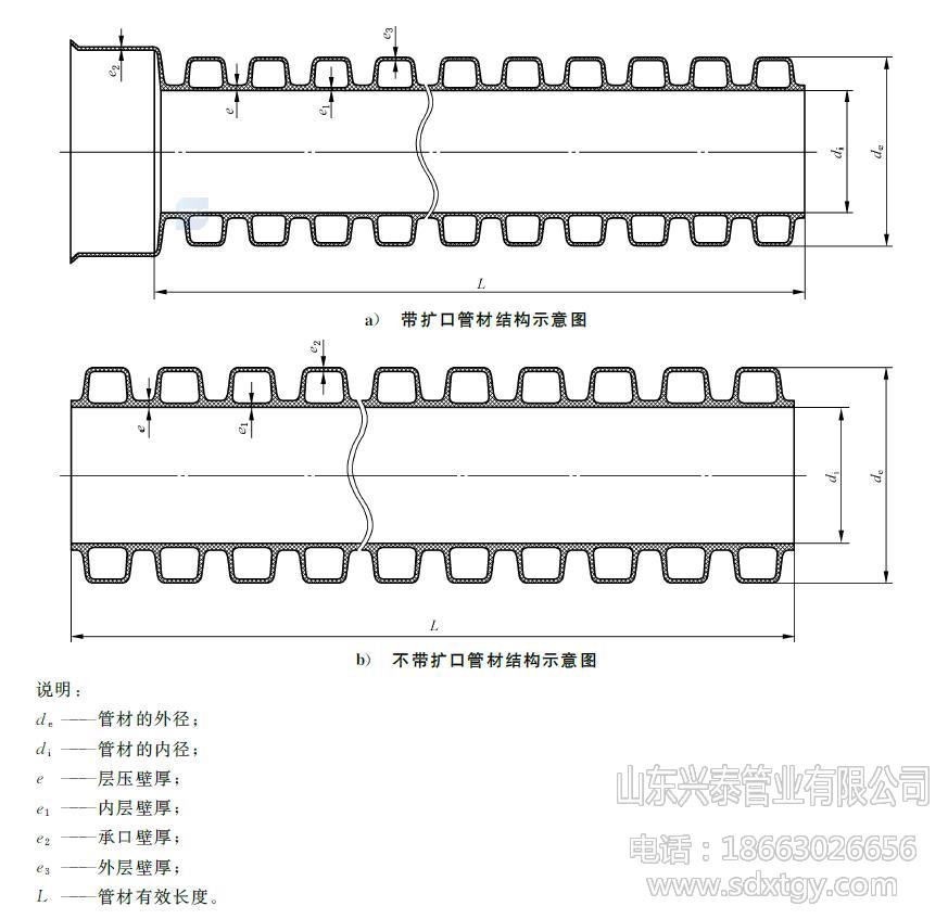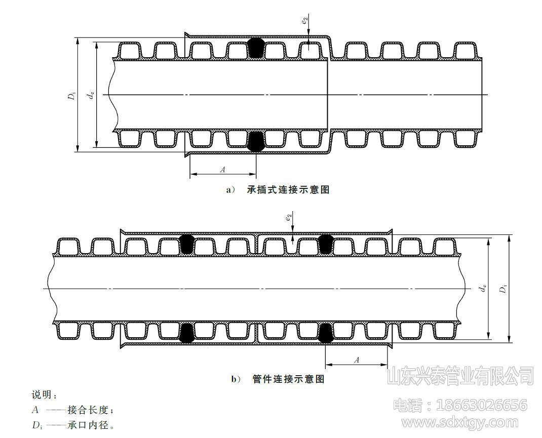产品名称:HDPE双壁波纹管,聚乙烯双壁波纹管 材料材质:PE/聚乙烯 执行标准:GB/T 19472.1 规格型号:DN/ID160-500mm(内径系列) 环刚度等级:SN4,SN8 外观颜色:外观内壁均为黑色 产品长度:6米/支 连接方式:弹性密封圈 生产厂家:山东兴泰管业有限公司 联系电话:186 6302 6656 (高经理) 适用温度:长期使用温度45℃以下的埋地排水、排污和通讯护套管用管材 产品介绍: HDPE双壁波纹管,简称PE波纹管,80年代初在德国首先研制成功,是一种以聚乙烯PE为原材料,经过挤出和特殊的成型工艺加工而成,内壁光滑,外壁为封闭波纹型的一种新型轻质管材,因采用了特殊的中空环形结构,具有优异的环刚度和良好的强度与韧性。具有重量轻、耐高压、韧性好、施工快、寿命长、摩擦系数小、连接方便可靠等特点。其优异的管壁结构设计,与其它结构的管材相比,成本大大降低。双壁波纹管已成为管道领域“以塑代钢”的首选管材,它克服了混凝土管,铸铁管等安装难度大、易锈蚀、水流阻力大、滋生细菌、寿命短的缺点。 PE双壁波纹管是为了在节省原材料而不致使管材的环刚度下降的前提下,对管材截面进行优化设计的一种内壁光滑平整、外壁为梯形或弧形波纹状、内外壁波纹间为中空、采用挤出成型工艺制成的管材。因为其主要原材料为聚乙烯(PE),故简称为PE双壁波纹管。 PE双壁波纹管内径系列管材尺寸(单位:mm) 公称内径 DN/ID 最小平均内径 dim,min 最小层压壁厚 emin 最小内层壁厚 e1,min 最小外层壁厚 e3,min 最小结合长度 Amin 200 195 1.5 1.1 0.9 54 300 294 2.0 1.7 1.0 64 400 392 2.5 2.3 1.8 85 500 490 3.0 3.0 2.1 96 PE双壁波纹管的优点 : 1、 产品结构独特,抗压能力强,具有足够安全可靠的环刚度; 2、 节约原材料,用同样的原材料做同一外径的管材时,波纹管比实壁管节省30%以上的原材料; 3、 重量轻,比重小于铸铁管和水泥管的50%; 4、 内壁表面光滑,不易产生沉积,摩擦系数小; 5、 PE双壁波纹管采用柔性密封圈连接,密封性能好,耐腐蚀,不结垢; 6、 具有良好的挠曲心梗,可适应土壤的不均匀沉降; 7、 连接便捷、施工进度快,与传统水泥管相比,采用PE波纹管可以提高3倍以上安装进度,明显降低施工费用,缩短施工周期; 8、 生产成本低,埋地使用可达50年以上,综合经济性能优越。 PE双壁波纹管的物理力学性能 项目 要求 环刚度/(kN/m2) SN4 SN8 ≥4 ≥8 冲击性能(TIR)/ % ≤10 环柔性 管材无破裂,两壁无脱开,内壁无反向弯曲 烘箱试验 无分层,无开裂 密度/(kg/m3) ≤1180 氧化诱导时间(200℃)/min ≥20 蠕变比率 ≤4 PE双壁波纹管的应用领域 : 1、 市政工程,用于建筑物的地下排水管、排污管、输水管、通风管等; 2、 公寓、住宅小区、农村地下埋设排水排污; 3、 电器电信工程,作为电力电缆、通讯光缆、通讯信号电缆的保护管; 4、 工业,由于聚乙烯材料具有优良的耐酸、碱及耐腐蚀能力,结构壁管可用于化工、医药、环保等行业的给水和排水管道; 5、 农业、园林工程,用于农田、果园、茶园以及林带排灌,可节水70%,节约用电13.9%,也可用于农村灌溉; 6、 道路工程,可用作铁路、高速公路、高尔夫球场、足球场等的渗、排水管; 7、 矿场,用作矿井的通风、送风管、排水管。 PE双壁波纹管的连接: HDPE双壁波纹管管道接头应采用弹性密封橡胶圈连接的承插式接口,橡胶圈接口应遵守下列规定: 1、接口前,应先检查橡胶圈是否配套完好,确认橡胶圈安放位置及插口的插入深度。 2、接口时,先将承口的内壁清理干净,并在承口内壁及插口橡胶圈上涂润滑剂,然后将承插口端面的中心轴线对齐。 3、接口方法应按下述程序进行:DN400及其以下管道,先由一人用棉纱绳吊住被安装管道的插口,另一人用长撬棒斜插入基础,并抵住该管端部中心位置的横挡板,然后用力将该管缓缓插入待安装HDPE双壁波纹管管道的承口至预定位置;DN400以上管道可用两台手扳葫芦将管节拉动就位。接口合拢时,管节两侧的手扳葫芦应同步拉动,使橡胶密封圈正确就位,不扭曲、不脱落。 PE双壁波纹管贮存方法: HDPE双壁波纹管应贮存于常温干燥库中,不宜暴晒。 HDPE双壁波纹管应平放,堆码高度不得超过4m。 HDPE双壁波纹管不允许与有毒有害物质混放,应远离热源,在存放处应设置醒目的禁火标志。 存放期自生产之日起,一般不得超过2年。